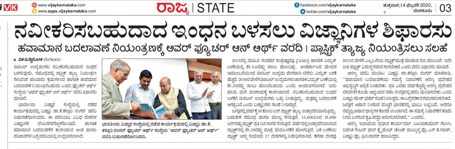 Feb 13, Bengalaru, India: The Future Earth South Asia Regional Office, Divecha Center for Climate Change (DCCC), and Indian Institute of Science (IISc) hosted an event open to nearly 300 students and faculty from colleges in and around Bengalaru. It featured contributions from K. Kasturirangan, former Chariman of the Indian Space Research Organisation (ISRO), among other distinguished regional scientists and politicians, and resulted in local media coverage.