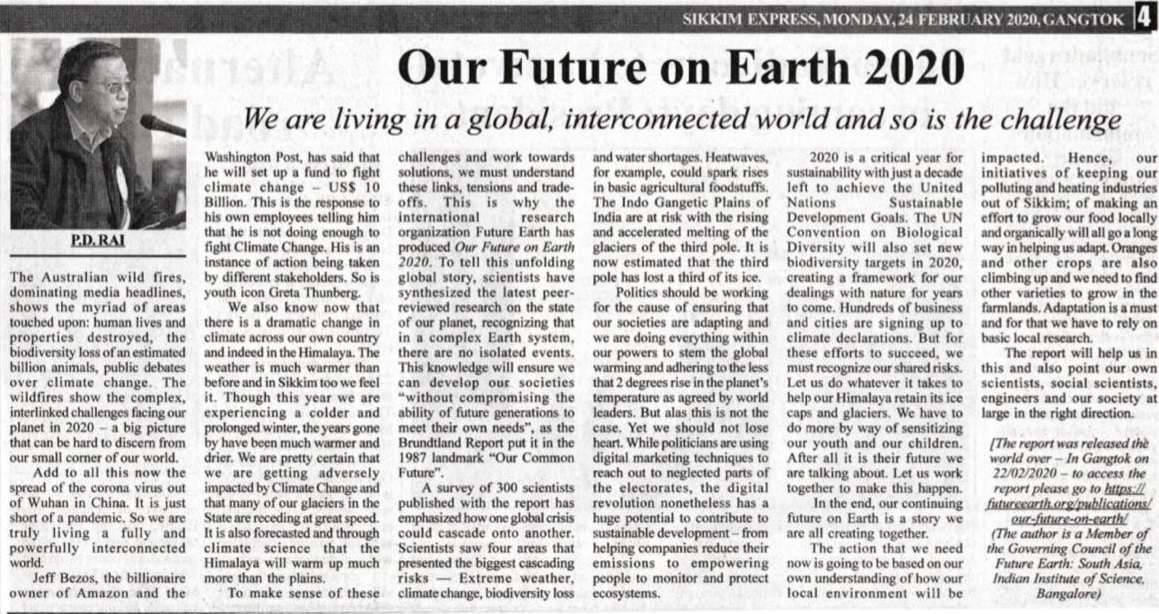 Feb 22, Sikkim, India: The Integrated Mountain Initiative (IMI) – Sikkim Chapter (inmi.in) in association with Eco-Tourism & Conservation Society of Sikkim (ECOSS), Gangtok; World Wildlife Fund, Sikkim and Darjeeling; and Sikkim University in partnership, with the Future Earth South Asia office at the Divecha Centre for Climate Change (DCCC) organized a launch event for students, policy representatives and the non-profit sector. The event was covered by the local media. The counselor of IMI Sikkim, Mr P.D. Rai, former Member of Parliament (Lok-Sabha, India) and member of the Future Earth South Asia Governing Council convened the event and published an opinion article in the Sikkim Express and Summit Times.