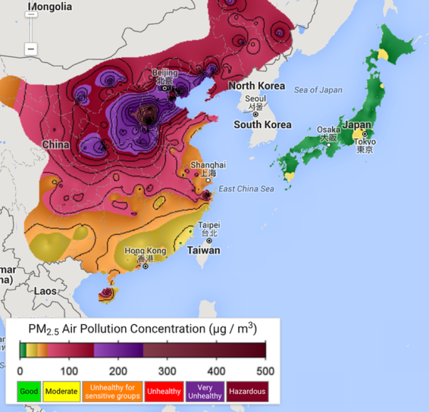 12. See this real-time map of air pollution around the world from Berkeley Earth. In 2017, air pollution has hit “very unhealthy” or “hazardous” levels in large parts of China and India (see map at right).