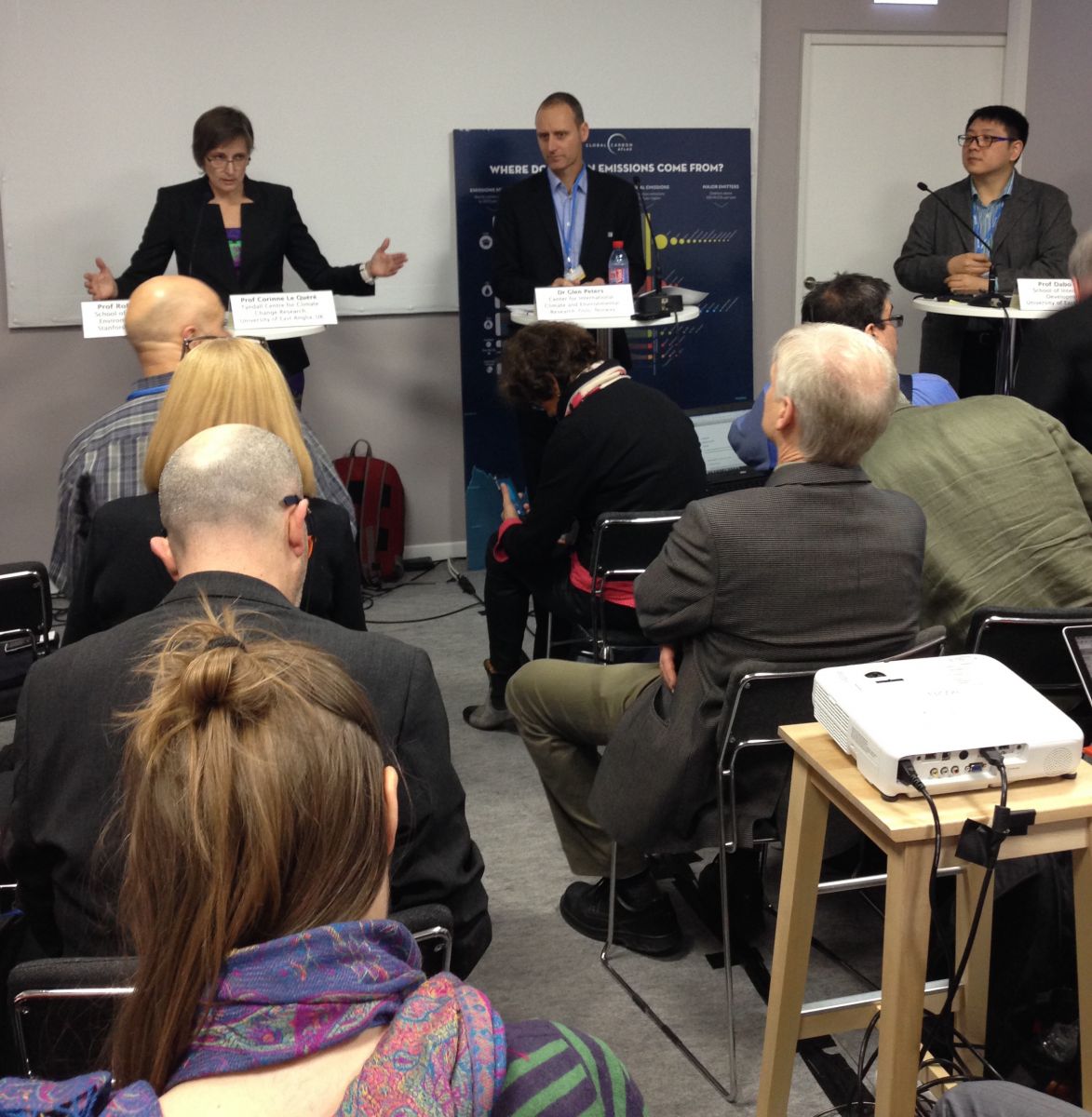 Corinne Le Quéré, Glen Peters and Dabo Gaun from the Global Carbon Project at the 2015 Global Carbon Budget press conference. Photo: Future Earth