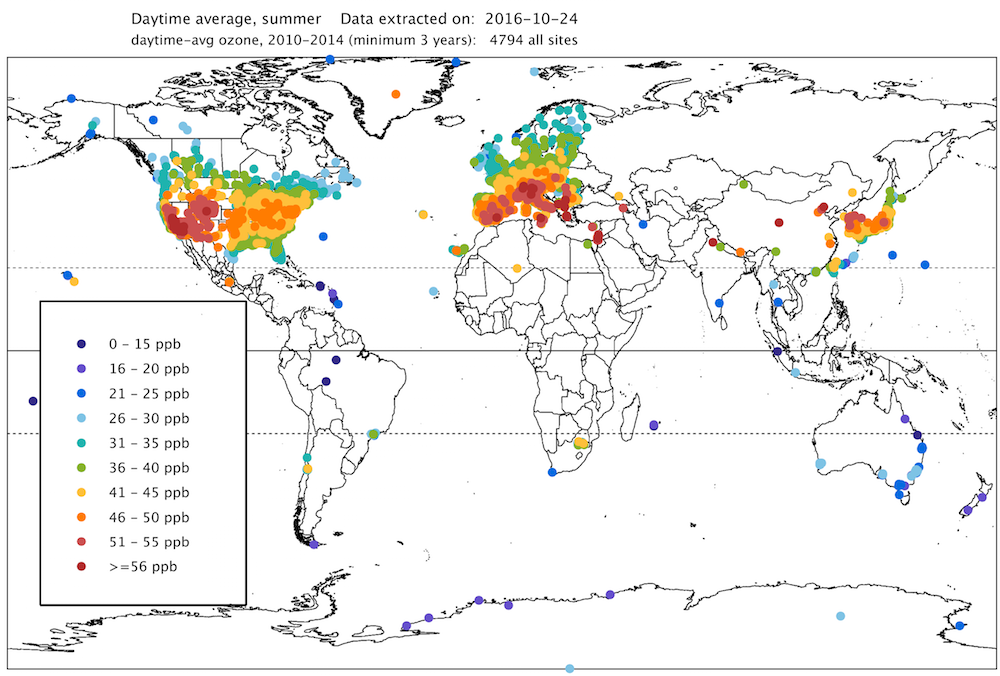 - In some parts of Asia, Africa and South America, the researchers identified data gaps which prevented them from characterizing ozone pollution exposure patterns. However, overall, Southern Hemisphere sites tend to have lower ozone pollution levels, and fewer days above 70 ppb.