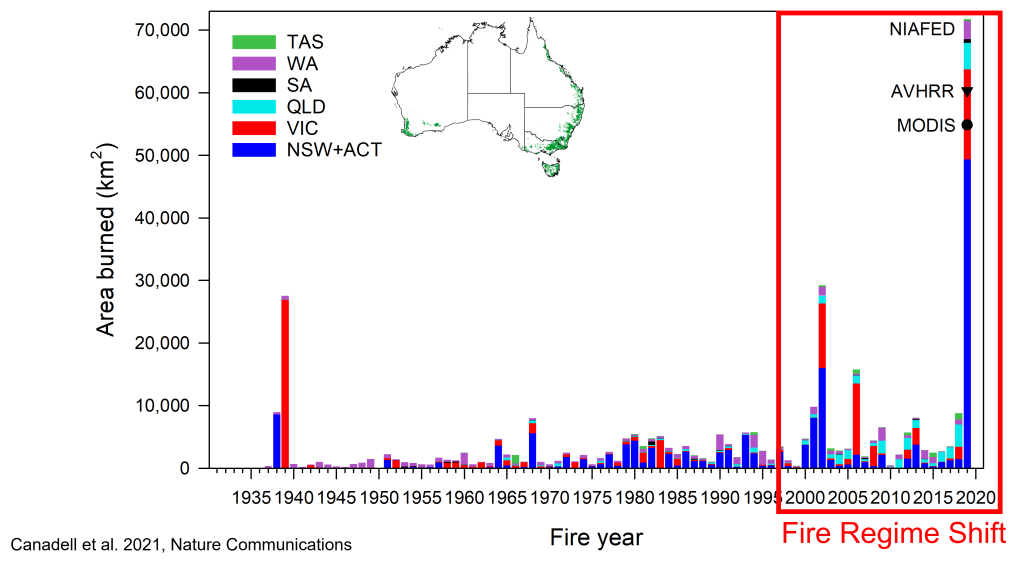 Canadell JG, Meyer CP, Cook G, Dowdy A, Briggs PR, Knauer J, Pepler A, Haverd V (2021) Multi-decadal increase of forest burned area in Australia is linked to climate change. Nature Communications 12:6921.