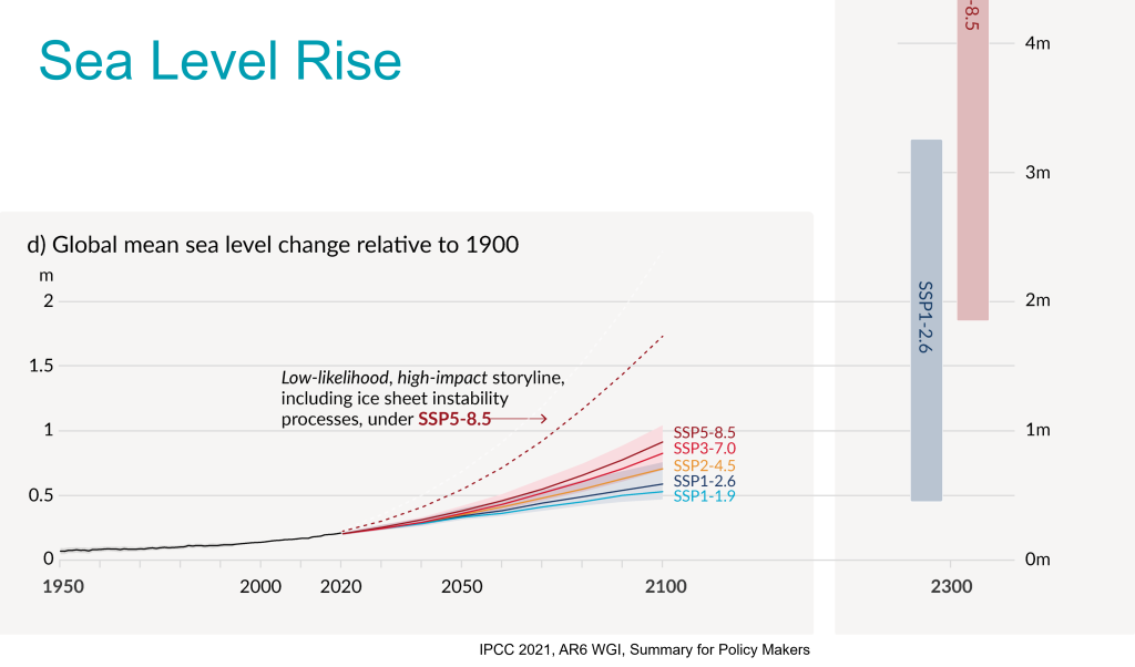 Finally, regardless which emission pathway we follow, there are impacts that will continue to grow well into the future. The most striking example is sea level rise which will continue for hundreds of years even after we reach net zero emissions. A successful Paris Agreement with climate stabilization at or below 2 °C will lead to close to an average of 2 m of sea level rise by 2300. This high sea level rise is among the best-known long-term impacts of climate change which will undoubtedly reshape the world’s coastlines and negatively impact tens of thousands of coastal cities and towns. Progressive adaptation might be a suitable approach for a number of impacts, while a longer-term view might be the most cost-effective approach for large adaptation infrastructure projects.